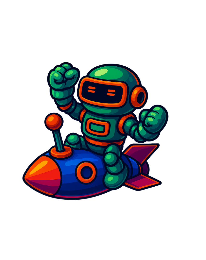 Arcatrix staat als een vintage arcadekampioen — in neon-groen pantser met gloeiende oranje accenten. Zijn vizier flikkert met pixelpatronen en op zijn borst prijkt een cassettevormig symbool: eerbetoon aan retrocartridges en vergeten highscores. In zijn handen? Een klassieke joystick-console, rechtstreeks in zijn armen bedraad. Elektrische stralen schieten rondom hem, alsof hij direct in het nostalgie-grid is ingeplugd. Hij staat op een gloeiende arcadevloer — altijd klaar om op Start te drukken.